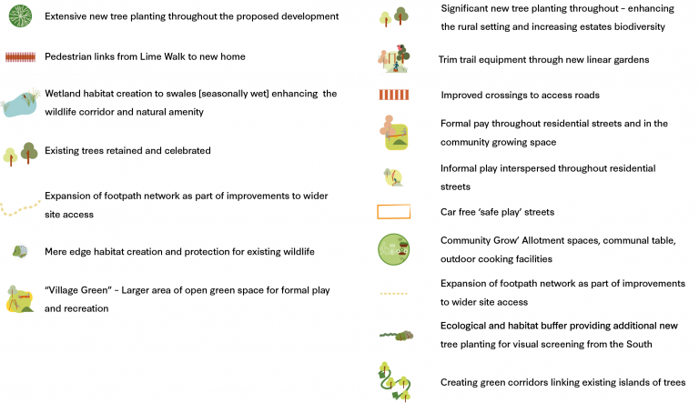 Reducing commuting traffic by providing more local housing, decreasing congestion and lowering emissions. An enhanced public access network to the estate’s woodland, parkland and Blue and Green Corridors. This includes delivering the Cycle Route for Improvement and Aspirational Cycling Route identified in the Knutsford Neighbourhood Plan