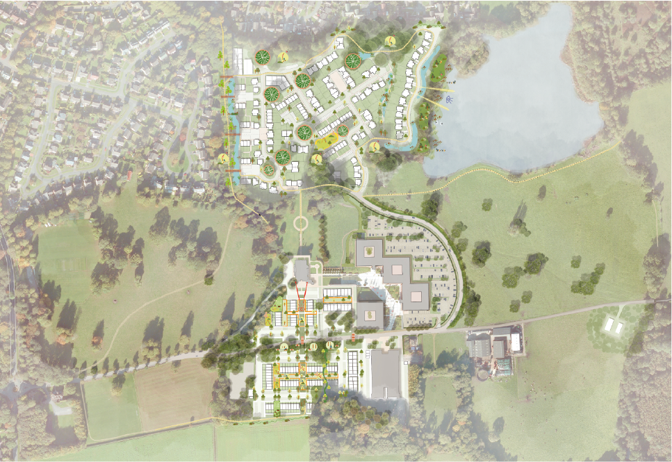 Our proposed masterplan preserves key natural features, including mature trees and the Mere, while providing much-needed housing on safeguarded land and underutilised brownfield areas within the core commercial area and large car park of the estate.